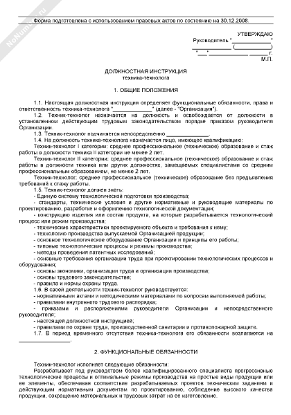 Должностная инструкция техника. I. Общие положения. 1. Техник относится к категории специалистов;. 2. На должность: - техника назначается лицо.